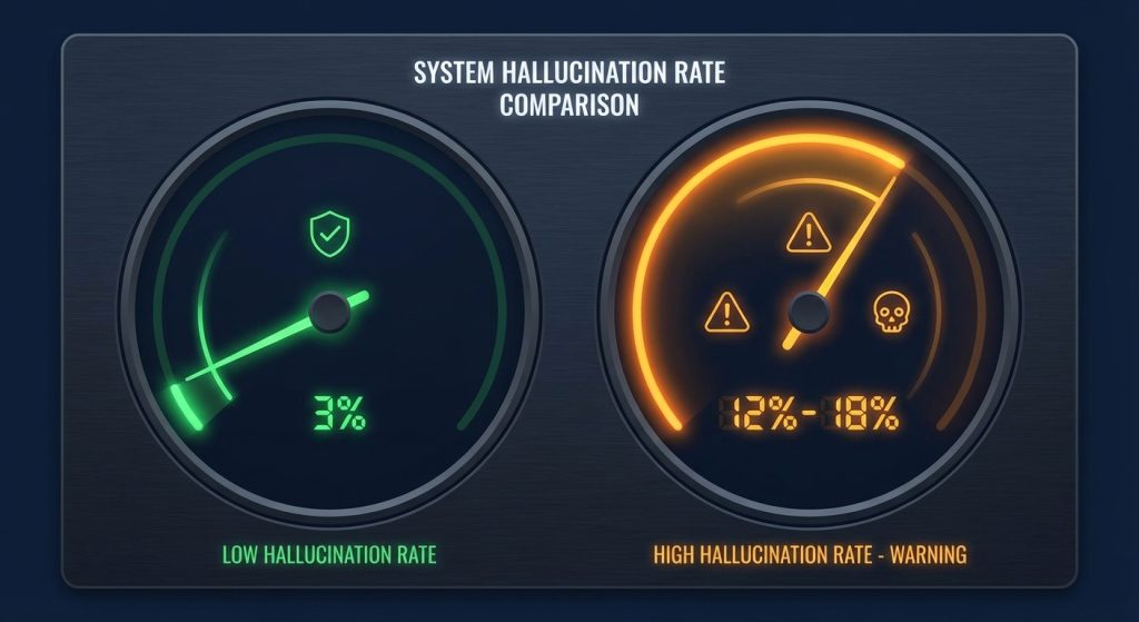 We also measured “confident hallucination” rates: instances where the model provided incorrect information with high apparent certainty. RAG hallucination rate: 3%. Context-stuffing hallucination rate: 12 to 18%. The larger the context, the more willing the model seemed to confabulate.